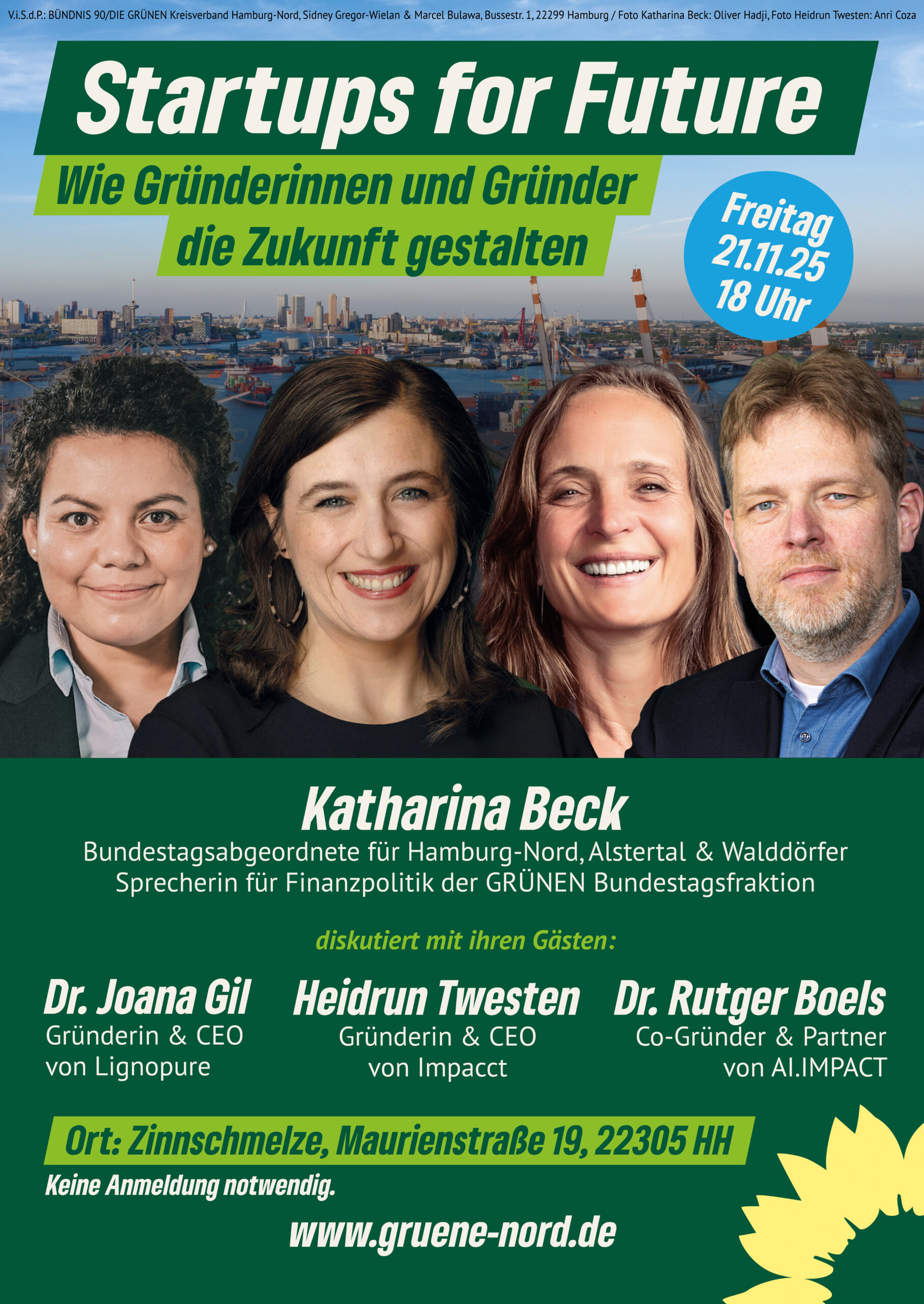 Unter dem Titel „Startups for Future – wie Gründerinnen und Gründer die Zukunft gestalten“ lädt die Hamburger Bundestagsabgeordnete Katharina Beck, Sprecherin für Finanzpolitik und Berichterstatterin für Startups der Bundestagsfraktion von Bündnis 90/Die Grünen, am Freitag, den 21. November 2025, um 18:00 Uhr in die Zinnschmelze in Hamburg-Barmbek ein.